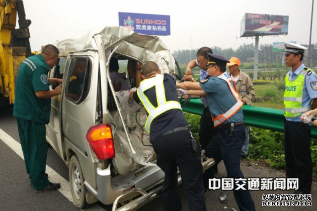 7月22日11時(shí)28分,在沈陽(yáng)方向K276+100處的事故現(xiàn)場(chǎng),京秦支隊(duì)秦皇島大隊(duì)執(zhí)法人員姜大亮,正與其他救援人員一起,把受傷乘客從事故車(chē)中搶救出來(lái)。當(dāng)日上午,秦皇島大隊(duì)執(zhí)法人員高煥新、姜大亮,在巡查至沈陽(yáng)方向K276+100處時(shí),發(fā)現(xiàn)一輛貨車(chē)與一輛面包車(chē)發(fā)生了追尾事故,雖然現(xiàn)場(chǎng)無(wú)路損,但是,經(jīng)現(xiàn)場(chǎng)調(diào)查,倆執(zhí)法人員發(fā)現(xiàn):被追尾的面包車(chē)?yán)铮腥耸軅?,該?chē)后排座椅竟然還卡住了2名受傷乘客,情況緊急。
