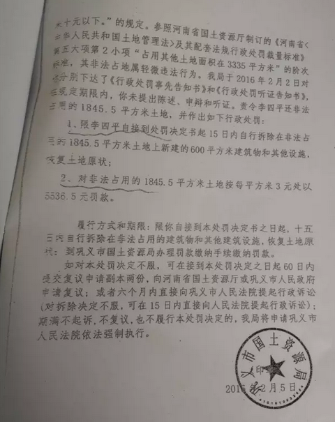 2016年鞏義市國土資源局再次對其作出處罰。 今年2月,鞏義市國土資源局再次對其作出處罰:李四平占用該村1845.5平方米集體土地,擴(kuò)建農(nóng)家樂,建筑面積為600平方米。其行為違反了相關(guān)土地法律法規(guī),責(zé)令李四平“15日內(nèi)自行拆除在非法占用的1845.5平方米土地上新建的600平方米建筑物和其他設(shè)施,恢復(fù)土地原狀;對非法占用的1845.5平方米土地按每平方米3元處以5536.5元罰款。” 國土資源局:違法成本低執(zhí)法困難 8月29日下午,鞏義市國土資源局工作人員向前街一號(qianjieyihao)記者介紹,該處確實(shí)存在非法占用林地的情況,并且已經(jīng)兩次對其處罰。該市國土資源局執(zhí)法大隊(duì)副隊(duì)長劉笑楠稱,按照我國土地管理法和《河南省實(shí)施(土地管理法)辦法》規(guī)定,非法占用林地只能按照每平方米十元以下進(jìn)行處罰。參照河南省國土資源廳制定的《河南?。ㄖ腥A人民共和國土地管理法)及其配套法規(guī)行政處罰裁量標(biāo)準(zhǔn)》第五大項(xiàng)第2小項(xiàng)“占用其他土地面積在3335平方米以下”的階次標(biāo)準(zhǔn),其非法占地屬輕微違法行為,只能按照每平方米處罰3元的標(biāo)準(zhǔn)進(jìn)行處罰。