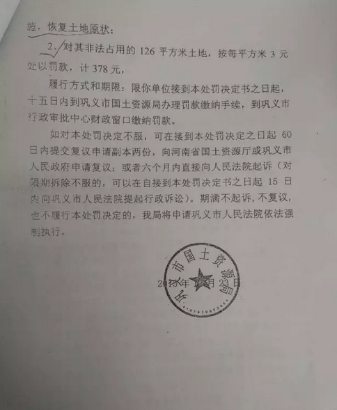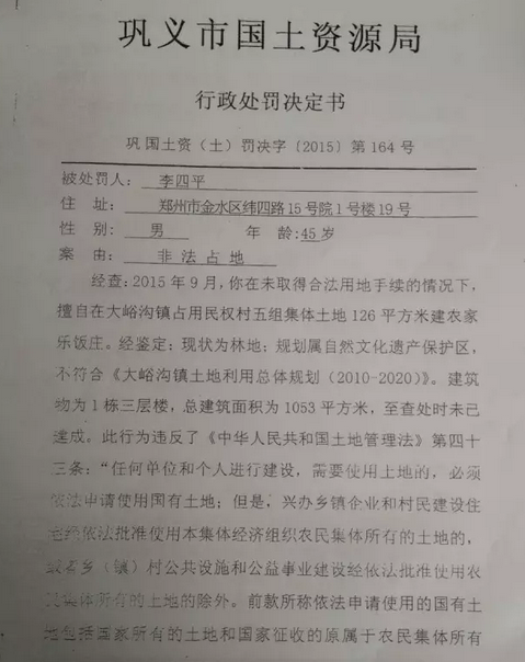 2015年鞏義市國土資源局對其做出處罰。 據(jù)知情人介紹,2015年12月份和今年2月份,鞏義市國土資源局曾兩次派人到現(xiàn)場調(diào)查了解,認(rèn)為這是在非法侵占林地和可耕地進(jìn)行非法建設(shè),并下達(dá)行政處罰決定書,責(zé)令違法人員李四平停止建設(shè)恢復(fù)林地。2016年1月,鞏義市林業(yè)局也曾下達(dá)行政處罰決定書,責(zé)令其停止采伐,恢復(fù)原狀。但該處建筑工程一直未能停工,也沒有進(jìn)行林地恢復(fù)。 處罰:非法占地一平方米罰3元 據(jù)前街一號(qinajieyihao)記者獲取的材料顯示,2015年12月份,鞏義市國土資源局對李四平進(jìn)行處罰,案由為“非法占地”。李四平擅自占用集體土地126平方米,建設(shè)農(nóng)家樂。土地性質(zhì)為林地,規(guī)劃屬自然與文化遺產(chǎn)保護(hù)區(qū)。材料顯示,對李四平處罰為“自行拆除在非法占用的126平方米土地上新建的建筑物和其他設(shè)施,恢復(fù)土地原狀”、“對非法占用的126平方米土地,按每平方米3元處以罰款,共378元。”