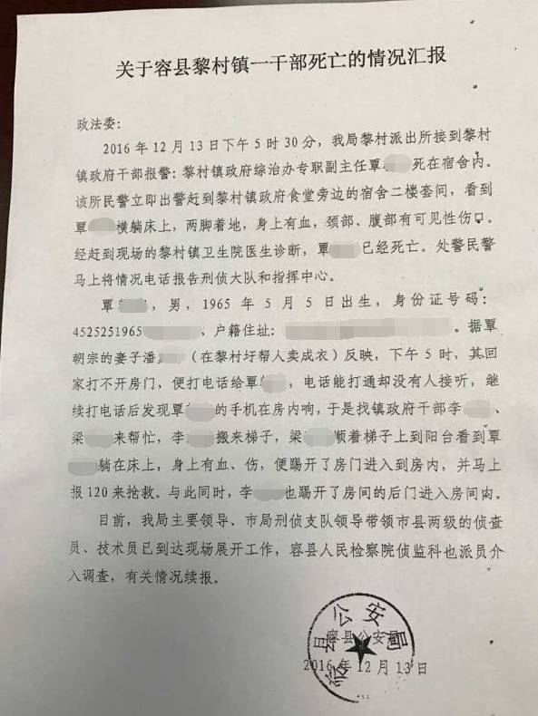 廣西一鎮(zhèn)干部被發(fā)現(xiàn)死在宿舍 頸部腹部有傷口