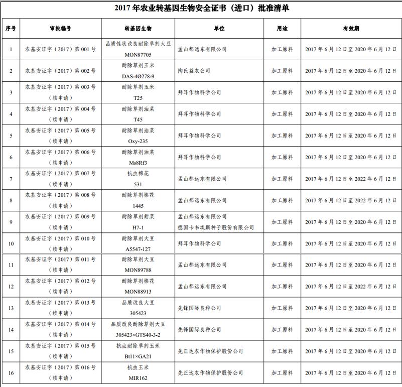 人民網(wǎng)北京6月14日電(記者賀迎春)農(nóng)業(yè)部網(wǎng)站消息,中國農(nóng)業(yè)部14日發(fā)布了2017年轉(zhuǎn)基因生物安全證書進口清單。此次批準的16個轉(zhuǎn)基因生物安全證書(進口)中,涉及到的轉(zhuǎn)基因生物為大豆、玉米、油菜、棉花、甜菜,用途皆為“加工原料”。 獲得證書的公司有孟山都、拜耳、陶氏益農(nóng)、先鋒國際、先正達,證書有效期大多為3年,即2017年6月12日至2020年6月12日。只有孟山都的棉花有效期達5年。 據(jù)悉,從2004年4月21日起,從事農(nóng)業(yè)轉(zhuǎn)基因生物貿(mào)易的進口商憑《農(nóng)業(yè)轉(zhuǎn)基因生物安全證書(進口)》和《農(nóng)業(yè)轉(zhuǎn)基因生物標識審查認可批準文件》到口岸出入境檢驗檢疫機構(gòu)辦理報檢手續(xù)。同時,農(nóng)業(yè)部開始受理《農(nóng)業(yè)轉(zhuǎn)基因生物安全證書(進口)》及《農(nóng)業(yè)轉(zhuǎn)基因生物標識審查認可批準文件》的申請,境外貿(mào)易商和進口商可同時辦理。發(fā)放安全證書需要進行相應的環(huán)境安全與食用安全檢測。