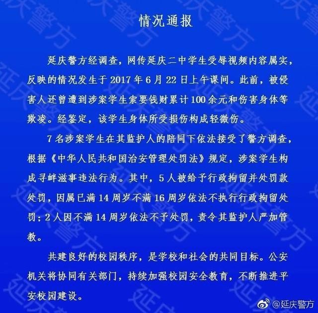 6月24日晚,有網(wǎng)友曝光北京市延慶二中一學(xué)生廁所受辱視頻,引發(fā)關(guān)注。 在1分30余秒的視頻中,身穿校服的少年被逼站在廁所角落,受盡侮辱,細(xì)節(jié)讓人作嘔。同時(shí),拍攝者不時(shí)飆出臟話,并手持棍棒敲打受害者。即便受害少年帶著哭腔求饒,仍遭遇臟話辱罵、敲打。 ![]() 北京延慶警方通報(bào):5人罰款 2人不處罰26日中午,延慶警方對事件進(jìn)行通報(bào)。經(jīng)調(diào)查,網(wǎng)傳延慶二中學(xué)生受辱視頻內(nèi)容屬實(shí),發(fā)生于22日上午課間,此前被害人還曾遭到索要錢財(cái)累計(jì)100余元和傷害身體等欺凌。警方通報(bào):7名涉案學(xué)生構(gòu)成尋釁滋事違法行為,其中5人被行政拘留并處罰款處罰,但因?qū)僖褲M14歲不滿16歲依法不執(zhí)行行政拘留處罰,2人因不滿14周歲不予處罰。 ![]() 北京教委回應(yīng):啟動(dòng)問責(zé)機(jī)制 @北京市教委今日發(fā)聲明稱,近日網(wǎng)曝延慶二中學(xué)生受辱事件后,感到非常痛心和震驚。要求并堅(jiān)決支持延慶區(qū)教委依法依規(guī)處理此事,對觸犯法律法規(guī)的學(xué)生嚴(yán)肅處理,并加強(qiáng)對學(xué)校的教育和管理,啟動(dòng)問責(zé)機(jī)制。 早前,延慶教委也發(fā)布通告,表示教委調(diào)查組已經(jīng)找到所有涉事學(xué)生及家長,就事情原委進(jìn)行全面調(diào)查。延慶二中也已經(jīng)安排專業(yè)教師對受欺凌學(xué)生進(jìn)行安撫和心理疏導(dǎo)。 ![]() 校園欺凌頻發(fā),問題究竟出在哪?到底該如何防治? 央視評論:三問校園欺凌:是“不能”還是“不為”? 又見校園欺凌!在長達(dá)1分30秒的視頻中,延慶二中受害學(xué)生痛哭流涕、苦苦哀求,卻依然忍受非人的折磨。這一幕,無疑將在漫長的歲月中成為受害學(xué)生和家長的夢魘。事實(shí)上就在去年,全國轟轟烈烈地展開了針對校園欺凌的攻堅(jiān)戰(zhàn),然而惡性案件依然頻頻發(fā)生。問題究竟出在哪里?我們怎樣才能給孩子一片安全寧靜的天空? 一問:說好的“預(yù)防”,緣何不見蹤影? 延慶二中發(fā)生的校園欺凌惡性案件,猖獗程度和對受害人身心損害的程度都極其嚴(yán)重。從視頻中能夠看出,幾名肇事者并非初犯,而是屢次為之。據(jù)受害學(xué)生介紹,肇事者曾經(jīng)屢次向其索要錢物,給其造成了嚴(yán)重的心理陰影。肇事者的種種表現(xiàn),難道學(xué)校和老師一無所知?受害學(xué)生長期生活在陰影中,難道也無察覺?肇事學(xué)生的壞毛病家長難道不知情? 眾所周知,杜絕校園欺凌關(guān)鍵在“預(yù)防”。發(fā)生了如此嚴(yán)重的校園欺凌案件,說好的預(yù)防緣何不見蹤影?去年,教育部、最高法、最高檢等九部門下發(fā)了《防治中小學(xué)生欺凌和暴力的指導(dǎo)意見》,國務(wù)院亦開展了校園欺凌專項(xiàng)治理,反校園欺凌暴力事件已經(jīng)上升為國家議程。而到了基層,轟隆隆的雷聲卻沒能變成傾盆大雨,以致如此惡性的案件再次發(fā)生。 △視頻截圖二問:又見“依法不追責(zé)”,我們手中真的沒有戒尺嗎? 事件發(fā)生后,延慶警方迅速行動(dòng)查明案件情況,然而處罰結(jié)果卻讓人頗感無奈。7名肇事者中5人已滿14周歲卻不滿16周歲,依法不執(zhí)行行政拘留處罰。另2人不滿14周歲,依法不予追責(zé),只能責(zé)令其監(jiān)護(hù)人嚴(yán)加管教。 我們常說“因材施教”,對于以如此惡意欺辱他人的未成年人,一句“嚴(yán)加管教”或“批評教育”顯然不是有效手段。這樣軟綿綿的懲處方式,既懲治不了當(dāng)事人,也無法震懾后來者。更重要的是,校方有無責(zé)任?是否學(xué)校應(yīng)當(dāng)為如此惡性的案件買單?監(jiān)護(hù)人是否存在失責(zé)情況?讓監(jiān)護(hù)人對肇事學(xué)生嚴(yán)加管教,那么家長在監(jiān)護(hù)和教育中的失責(zé)誰來管教? 對校園欺凌惡性案件的寬容,無疑就是對下一起類似事件的慫恿。道理我們都懂,手中的戒尺哪里尋找? ![]() 三問:我們是否真的把“校園安全”放在了重中之重的位置? “成績”和“安全”,究竟哪個(gè)更重要?面對這個(gè)問題,任何人都會(huì)給出正確的答案。然而行動(dòng)中,我們卻常常做出不同的選擇。“你不學(xué)可以,別影響其他同學(xué)學(xué)習(xí)”,面對性格存在缺陷并有暴力傾向的學(xué)生,班主任常常如是說。不知不覺間,孩子性格中的弊病愈發(fā)嚴(yán)重以致欺凌案件發(fā)生。“好好學(xué)習(xí),將來上個(gè)好大學(xué)”,家長常常如是說。慢慢地,性格養(yǎng)成在成績面前變得可有可無。 培養(yǎng)健康的身心,教會(huì)孩子在尊重的基礎(chǔ)上與人相處,這是教書育人的第一要?jiǎng)?wù)。很遺憾,我們常常本末倒置,而去追逐孩子在學(xué)業(yè)和考分上的增長。人的教育永遠(yuǎn)重于對知識(shí)的傳授,唯此才能肯定地說,我們把校園安全放在了重中之重的位置。 ![]() |
