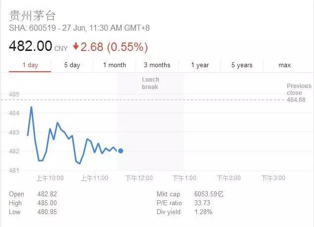 ▲圖片來源:茅臺2017年度一季報 根據(jù)茅臺公布的2017年度一季報顯示,茅臺在今年第一季度實現(xiàn)營業(yè)收入133億元,比去年同期增長33.24%;一季度凈利潤為61.23億元,比去年同期增長25.24%;每股收益也從去年同期的3.89元提高到4.87元。 一家茅臺頂35家互聯(lián)網(wǎng)公司 股價屢創(chuàng)歷史新高的A股“股神”貴州茅臺在昨天(6月26日)再次博得市場關(guān)注。茅臺股價昨天再度刷新歷史紀(jì)錄,收盤報484.68元,漲幅2.53%,總市值首次突破6000億元大關(guān)。 截至6月27日上午十一點半,茅臺股價暫報482元,市值6053.59億元。