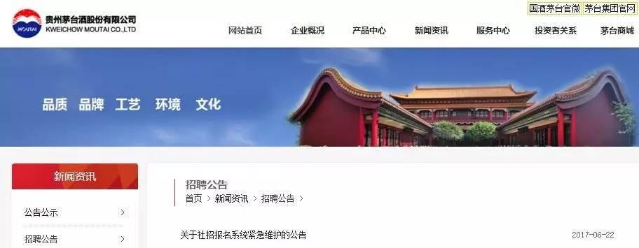 ▲圖片來源:茅臺官網(wǎng) 值得注意的是,茅臺本次招錄的人員均為合同學(xué)徒工,簽訂三年期勞動合同。根據(jù)招工簡章規(guī)定,工作表現(xiàn)差、不服從管理的,按公司規(guī)定處理并在合同期滿后不再續(xù)簽。 即使是學(xué)徒工崗位,也引來了只有公務(wù)員“國考”才能見到的罕見火爆競爭。茅臺原本設(shè)想的報名名額為2000人,但幾十萬人點擊報名,導(dǎo)致了報名系統(tǒng)崩潰。茅臺官網(wǎng)在6月22日發(fā)出了社招報名系統(tǒng)緊急維護的公告,分流報名流量。