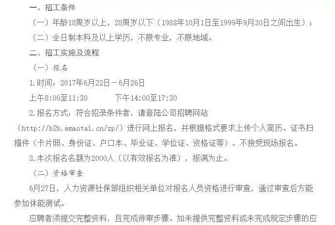 ▲圖片來源:茅臺官網(wǎng) 但是應(yīng)聘的火爆程度大大出乎茅臺公司的意料,報名系統(tǒng)也因訪問量過大而崩潰。要進(jìn)酒廠當(dāng)學(xué)徒工也不容易,每經(jīng)小編(微信號:nbdnews)查詢到,茅臺招聘酒廠工人要求本科以上學(xué)歷,并且要經(jīng)過體能測驗和文化筆試才能過關(guān)。 據(jù)錢江晚報引用茅臺員工爆料,茅臺酒廠工人不算五險一金,一年收入能有13萬元,并且早班中班兩班倒,每天上班時間只有5個小時左右。 如此優(yōu)厚的待遇,難怪這些引得萬人爭搶。據(jù)觀察者網(wǎng)報道,6月25日上午報名截止時,茅臺報名網(wǎng)頁點擊率為499.77萬,并且訪問數(shù)還在增加中。 面對這堪比公務(wù)員“國考”的恐怖競爭,很多和每經(jīng)小編(微信號:nbdnews)一樣錯過了招聘的網(wǎng)友紛紛吐槽,感嘆自己錯過了一輪致富機會。