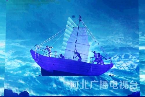 舞蹈《弄潮》。實(shí)體的道具大船揚(yáng)帆在虛擬的驚濤海浪中,營(yíng)造出“弄潮兒向濤頭立,手把紅旗旗不濕”的精神意境。