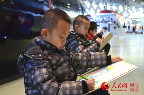 圖為2017年12月31日,幾名孩子在VR基地用畫筆書寫航天夢。 人民網(wǎng)石家莊1月3日電 用心靈體驗國家軍事科技的飛速發(fā)展,用手中的畫筆書寫心中美麗的航天夢元旦假期,在老師和父母的