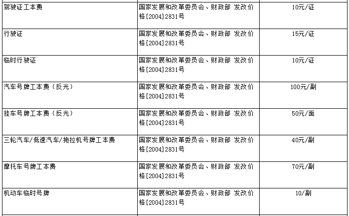 各類證件辦理收費(fèi)