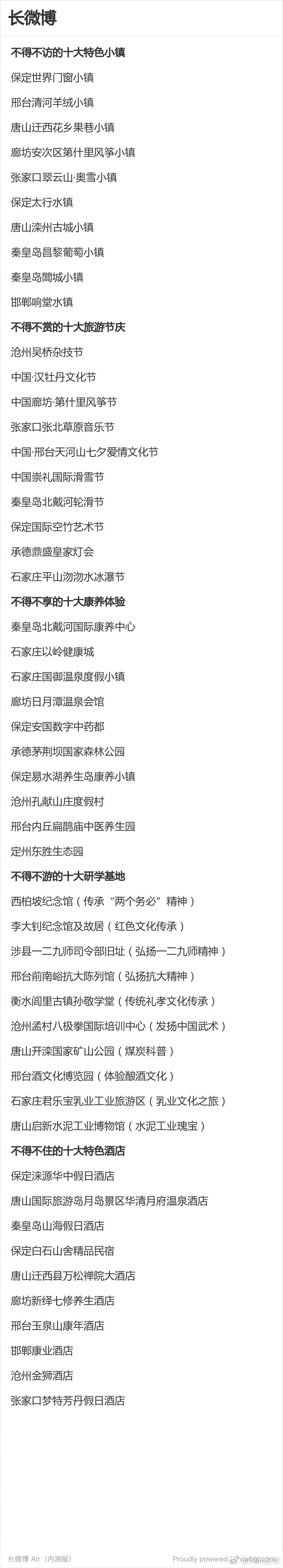 1月16日上午,在“樂享河北 開啟旅游新時代——2018河北旅游發(fā)布”活動上,河北省旅游發(fā)展委員會公布了2018河北旅游發(fā)布“不得不”系列評選活動十強名單,希望為您未來出行提供有益借鑒。詳情戳圖↓↓ ![]() ![]() |