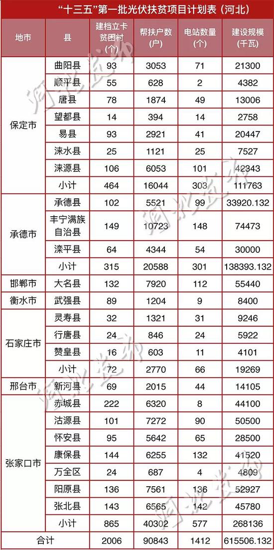 近日,國家能源局、國務(wù)院扶貧辦關(guān)于下達(dá)“十三五”第一批光伏扶貧項目計劃的通知,本次下達(dá)項目河北有23個縣、2006個貧困村,幫扶戶數(shù)達(dá)90843,計劃建設(shè)電站數(shù)量1412個。