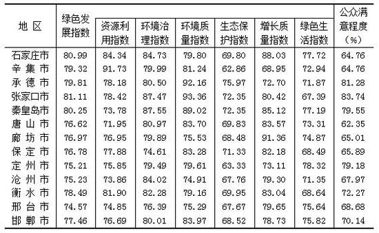 河北新聞網(wǎng)訊(記者張巖)日前,河北省統(tǒng)計局、省發(fā)改委、省環(huán)保廳、省委組織部聯(lián)合發(fā)布《2016年河北省生態(tài)文明建設(shè)年度評價結(jié)果公報》,公布了2016年度河北省各設(shè)區(qū)市和省直管縣的綠色發(fā)展指數(shù)和公眾滿意程度。 據(jù)了解,這一結(jié)果是根據(jù)河北省委辦公廳、河北省政府辦公廳印發(fā)的《河北省生態(tài)文明建設(shè)目標(biāo)評價考核辦法》和省發(fā)改委、省統(tǒng)計局、省環(huán)保廳、省委組織部印發(fā)的《河北省綠色發(fā)展指標(biāo)體系》《河北省生態(tài)文明建設(shè)考核目標(biāo)體系》要求發(fā)布。 生態(tài)文明建設(shè)年度評價中,綠色發(fā)展指數(shù)采用綜合指數(shù)法進(jìn)行測算。綠色發(fā)展指標(biāo)體系包括資源利用、環(huán)境治理、環(huán)境質(zhì)量、生態(tài)保護(hù)、增長質(zhì)量、綠色生活、公眾滿意程度等7個方面,共59項評價指標(biāo)。其中,前6個方面的58項評價指標(biāo)納入綠色發(fā)展指數(shù)的計算;公眾滿意程度調(diào)查結(jié)果進(jìn)行單獨(dú)評價與分析。公眾滿意程度為主觀調(diào)查指標(biāo),通過河北省統(tǒng)計局組織的抽樣調(diào)查來反映公眾對生態(tài)環(huán)境的滿意程度。 從2016年河北省生態(tài)文明建設(shè)年度評價結(jié)果看,各設(shè)區(qū)市綠色發(fā)展指數(shù)值從高到低的排序依次為:張家口、石家莊、秦皇島、承德、衡水、邯鄲、廊坊、保定、唐山、滄州、邢臺。 從構(gòu)成綠色發(fā)展指數(shù)的6項分類指數(shù)得分來看,石家莊市在資源利用指數(shù)和綠色生活指數(shù)兩項排名上均位居第一,環(huán)境治理指數(shù)位居第一的為秦皇島市,環(huán)境質(zhì)量指數(shù)位居第一的為張家口市,生態(tài)保護(hù)指數(shù)位居第一的為承德市,增長質(zhì)量指數(shù)位居第一的為廊坊市。 各設(shè)區(qū)市公眾滿意程度排名依次為:張家口市、承德市、秦皇島市、衡水市、邯鄲市、邢臺市、滄州市、保定市、廊坊市、石家莊市、唐山市。 定州市和辛集市作為省直管縣,不與其他設(shè)區(qū)市進(jìn)行比較,單獨(dú)排序。 表1 2016年河北省(各設(shè)區(qū)市)生態(tài)文明建設(shè)年度評價結(jié)果排序 表2 2016年河北省直管縣生態(tài)文明建設(shè)年度評價結(jié)果排序 表3 2016年河北省生態(tài)文明建設(shè)年度評價結(jié)果![]() |