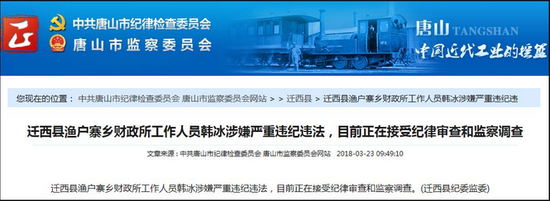 據(jù)唐山市紀委監(jiān)委網(wǎng)站消息, 遷西縣漁戶寨鄉(xiāng)財政所工作人員韓冰涉嫌嚴重違紀違法,目前正在接受紀律審查和監(jiān)察調查; 路北區(qū)人才市場工作人員王婧涉嫌嚴重違法,目前正在接受