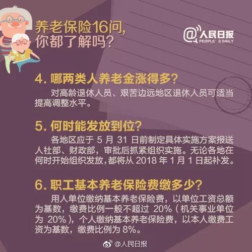 人社部、財政部聯(lián)合下發(fā)《關(guān)于2018年調(diào)整退休人員基本養(yǎng)老金的通知》,明確從2018年1月1日起,為2017年底前已按規(guī)定辦理退休手續(xù)并按月領(lǐng)取基本養(yǎng)老金的企業(yè)和機關(guān)事業(yè)單位退休人員提高基本養(yǎng)老金水平,總體調(diào)整水平為2017年退休人員月人均基本養(yǎng)老金的5%左右。