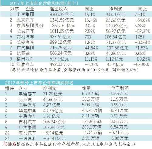 進(jìn)入五月份,各大上市車(chē)企的去年年報(bào)全部出爐。市場(chǎng)最關(guān)注的“八卦”來(lái)了——中國(guó)車(chē)企哪個(gè)最能賺錢(qián)?哪個(gè)單車(chē)?yán)麧?rùn)最高?誰(shuí)看起來(lái)賺了不少但其實(shí)“外強(qiáng)中干”?記者在24家上市整車(chē)企業(yè)的年報(bào)中留意到,上汽集團(tuán)依然是中國(guó)車(chē)企的“龍頭企業(yè)”,但廣汽集團(tuán)和吉利集團(tuán)成為了自主品牌中的“尖子生”,表現(xiàn)耀眼。除此之外,商用車(chē)領(lǐng)域賺錢(qián)能力讓人“跌破眼鏡”,部分乘用車(chē)企業(yè)深陷虧損泥潭。 中國(guó)車(chē)企盈利能力參差不齊 上汽集團(tuán)依然是“龍頭” 記者留意到,上汽集團(tuán)依然是國(guó)內(nèi)車(chē)企中的“龍頭”企業(yè),2017年,上汽集團(tuán)在產(chǎn)銷(xiāo)規(guī)模、營(yíng)收、利潤(rùn)等幾項(xiàng)“大指標(biāo)”上蟬聯(lián)寶座,而且營(yíng)收和銷(xiāo)量也遠(yuǎn)超前十車(chē)企的總數(shù)。年報(bào)顯示,上汽集團(tuán)以8706.39億元位居國(guó)內(nèi)車(chē)企營(yíng)業(yè)收入第一,同比增長(zhǎng)15.10%,是國(guó)內(nèi)最賺錢(qián)的汽車(chē)集團(tuán),凈利潤(rùn)為344.1億元,同比增長(zhǎng)7.51%,凈利潤(rùn)率是3.95%。2017年上汽集團(tuán)營(yíng)收是位列第二的北汽的6倍之多,且占據(jù)到了整個(gè)上市車(chē)企營(yíng)收的一半,第2名到第24名車(chē)企的營(yíng)業(yè)收入相加,總和也才9962.48億元。 不容忽視的是,得益于產(chǎn)品銷(xiāo)量的增長(zhǎng),中國(guó)重汽、吉利汽車(chē)、廣汽集團(tuán)等幾家車(chē)企的營(yíng)收增長(zhǎng)也非常搶眼。其中吉利汽車(chē)2017年?duì)I收為927.61億元,同比增長(zhǎng)73%,凈利潤(rùn)為106.34億元,同比增長(zhǎng)108%;廣汽集團(tuán)2017年?duì)I收為715.75億元,同比增長(zhǎng)44.84%,凈利潤(rùn)為107.86億元,同比增長(zhǎng)71.53%。 廣汽和吉利成為自主品牌“尖子生” 在凈利潤(rùn)規(guī)模方面,雖然上汽以344.1億元將其他公司遠(yuǎn)遠(yuǎn)扔在后面。但東風(fēng)集團(tuán)股份、廣汽集團(tuán)和吉利汽車(chē)都實(shí)現(xiàn)了百億級(jí)別的凈利潤(rùn)。最為突出的是吉利和廣汽,不僅營(yíng)收增幅喜人,在凈利潤(rùn)額上也位居前列。廣汽集團(tuán)以15.07%的凈利潤(rùn)率成為國(guó)內(nèi)汽車(chē)行業(yè)整車(chē)上市公司中利潤(rùn)率最高的車(chē)企。廣汽七成以上的利潤(rùn)增幅得益于自主板塊,旗下自主品牌“傳祺”強(qiáng)勢(shì)拉動(dòng)增長(zhǎng),是當(dāng)之無(wú)愧的優(yōu)秀自主品牌的“尖子生”典范。同樣的,吉利更是風(fēng)頭十足,不談李書(shū)福一系列的收購(gòu)行為,近年吉利在產(chǎn)品、營(yíng)銷(xiāo)方面的發(fā)力,讓吉利去年利潤(rùn)同比增長(zhǎng)108%至106.34億元,利潤(rùn)呈爆發(fā)式增長(zhǎng)。 反觀此前靠SUV大火的長(zhǎng)城汽車(chē),去年由于營(yíng)銷(xiāo)開(kāi)支增長(zhǎng)、研發(fā)投入擴(kuò)大和哈弗銷(xiāo)量滑坡,利潤(rùn)腰斬??梢哉f(shuō),論英雄還看今朝。吉利和廣汽等“尖子生”,誰(shuí)能更持久地向上攀升,將決定誰(shuí)是更優(yōu)秀的自主企業(yè)代表。 商用車(chē)盈利能力上升明顯 商用車(chē)領(lǐng)域的盈利能力更不容小覷。在2017年上市車(chē)企凈利潤(rùn)增幅方面,金龍汽車(chē)實(shí)現(xiàn)了扭虧為盈,達(dá)到4.7億元,致使凈利潤(rùn)同比達(dá)到166.64%;中國(guó)車(chē)企中,凈利潤(rùn)增幅排名第四也是屬于商用車(chē)板塊的中國(guó)重汽,凈利潤(rùn)同比增長(zhǎng)114.63%至8.97億元。中國(guó)汽車(chē)工業(yè)協(xié)會(huì)表示,在國(guó)家經(jīng)濟(jì)“穩(wěn)中有升”、供給側(cè)改革初見(jiàn)成效、基建工程投資不斷增加的宏觀背景下,工程車(chē)市場(chǎng)容量持續(xù)擴(kuò)大,公路貨運(yùn)穩(wěn)定增長(zhǎng),同時(shí)受新版GB1589標(biāo)準(zhǔn)實(shí)施、“9.21治超”以及更加嚴(yán)格的環(huán)保政策等方面的影響,重卡市場(chǎng)出現(xiàn)了爆發(fā)式增長(zhǎng)。中國(guó)重汽成為這一市場(chǎng)中較為出色的代表。 不過(guò),國(guó)內(nèi)車(chē)企盈利能力參差不齊,部分車(chē)企陷入虧損的泥沼,主要集中在乘用車(chē)板塊。如北汽、長(zhǎng)城、江淮、江鈴等幾家因銷(xiāo)量大幅腰斬因素導(dǎo)致利潤(rùn)同比下滑。較為嚴(yán)重的是海馬汽車(chē)凈利潤(rùn)下滑532%至虧損9.94億元;而墊底的一汽夏利因夏利品牌停產(chǎn)被雪藏等因素“跌跌不休”,2017年更是巨虧16.41億元,凈利潤(rùn)同比下滑1100%。 必須一提的是,在24家上市整車(chē)公司里,凈利率最高的桂冠竟是華晨汽車(chē),雖然營(yíng)業(yè)收入僅為53億元,但凈利潤(rùn)就達(dá)到了43.76億元,凈利潤(rùn)率為82.5%,幾乎是上汽集團(tuán)的20倍。不過(guò)別驚訝,華晨汽車(chē)就是“躺著收錢(qián)”的典范,在華晨中國(guó)的年報(bào)中有這樣一句話(huà)“寶馬對(duì)集團(tuán)純利貢獻(xiàn)由2016年的39.98億元增加31.0%至2017年52.38億元”。別替華晨高興,合資品牌的強(qiáng)大也正凸顯華晨自主品牌的孱弱,扣除寶馬貢獻(xiàn)的52.38億元純利潤(rùn),囊括在上市公司里的華晨自主業(yè)務(wù)上的凈虧損達(dá)到了8.62億元,幾乎可以“媲美”海馬。 客車(chē)單車(chē)