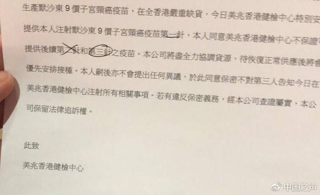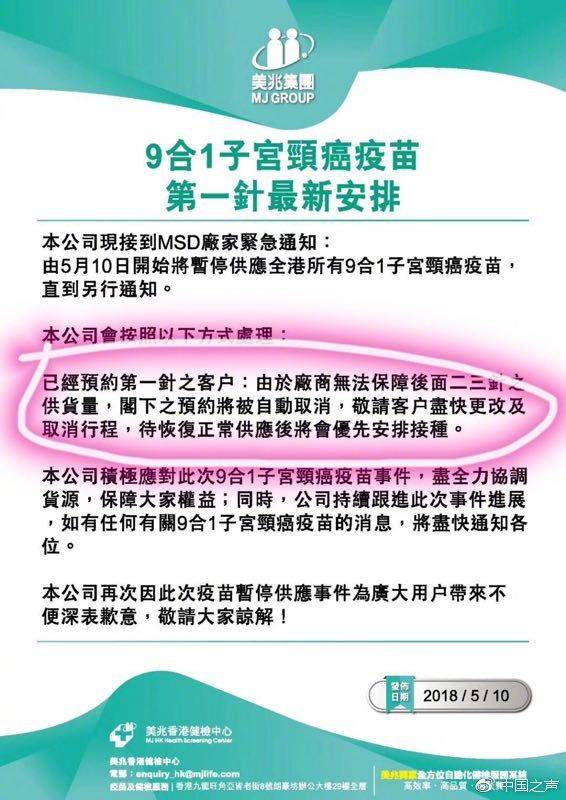 有數(shù)據(jù)顯示,內(nèi)地已經(jīng)有200萬(wàn)左右的消費(fèi)者選擇前往香港注射九價(jià)宮頸癌疫苗。龐大的市場(chǎng)需求也催生了“內(nèi)地女性赴港打疫苗”的產(chǎn)業(yè)鏈。 九價(jià)宮頸癌疫苗一共分3期注射,每期注射一針。但近日香港多家醫(yī)療機(jī)構(gòu)發(fā)布通知稱,已經(jīng)接到默沙東藥廠正式通知,暫停向全港供應(yīng)九價(jià)宮頸癌疫苗。不少已經(jīng)打了第一針、第二針的消費(fèi)者被告知:要么取消,要么延期,無(wú)法保證此后一到兩針的供應(yīng)。 然而,記者調(diào)查發(fā)現(xiàn),在“疫苗告急”的通知發(fā)布之后,有香港醫(yī)療機(jī)構(gòu)仍在給部分客戶打“第一針”,明明存貨有限,卻還在服務(wù)新客戶。部分“赴港打疫苗”中介也在招攬新客戶。這究竟是什么原因?消費(fèi)者的權(quán)益如何維護(hù)?緊張的供需矛盾又是否會(huì)滋生“地下市場(chǎng)”? 客戶已交全款,但醫(yī)療機(jī)構(gòu)稱無(wú)法保證疫苗有貨 美兆香港體檢中心5月10號(hào)發(fā)布通知稱,已經(jīng)預(yù)約第一針的客戶,由于廠商無(wú)法保障之后的第二、第三針的供應(yīng)量,客戶的預(yù)約將被自動(dòng)取消,請(qǐng)客戶盡快更改或取消行程。然而,內(nèi)地的邱女士向中國(guó)之聲記者提供了相關(guān)單據(jù)圖片,圖片顯示,在美兆發(fā)布通知之后的5月11號(hào),美兆香港體檢中心還是為邱女士提供了接種“第一針”疫苗的服務(wù),還預(yù)約了第二針的日期,預(yù)約時(shí)間為2019年1月。
