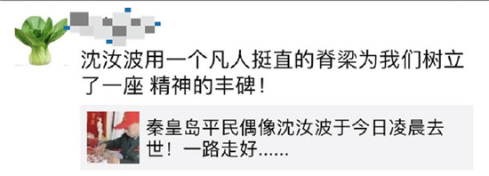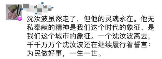 沈汝波說:“螢火蟲的光芒雖小,卻承載著夢(mèng)想,今生我愿做小小螢火蟲,用微弱的光照亮周圍的人。他們快樂,我也快樂,他們幸福,我也幸福。”寥寥數(shù)語,樸實(shí)無華,擲地有聲。我們生活在同一座城市,生活在一個(gè)大家庭里,毫無疑問,只要人人都獻(xiàn)出一點(diǎn)愛,世界將變成美好的人間。接力沈汝波、為民做好事,讓文明之風(fēng)吹遍秦皇島的每個(gè)角落,我們的城市就一定會(huì)更加文明,我們共同的家園就一定會(huì)更加溫馨。 聚是一團(tuán)火散是滿天星沈汝波一路走好! 優(yōu)秀共產(chǎn)黨員、“中國(guó)好人”“燕趙楷模”,秦皇島人沈汝波因患食道癌,經(jīng)救治無效,于6月1日凌晨1時(shí)15分不幸逝世,享年58歲。