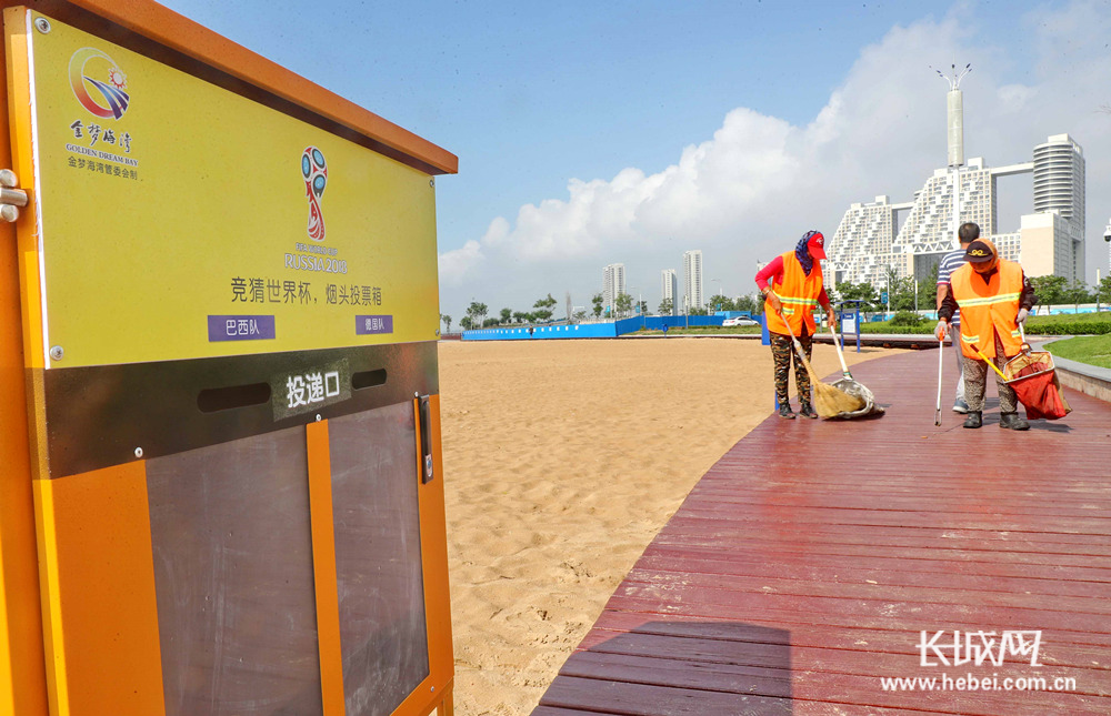 金夢(mèng)海灣片區(qū)的投票式煙頭收集箱。 今日,秦皇島市海港區(qū)金夢(mèng)海灣管委會(huì)推出了新型煙頭收集箱,他們?cè)诤┥瞎苍O(shè)立了6個(gè)單面透明的煙頭收集箱,左右兩格分別標(biāo)注上世界杯奪冠