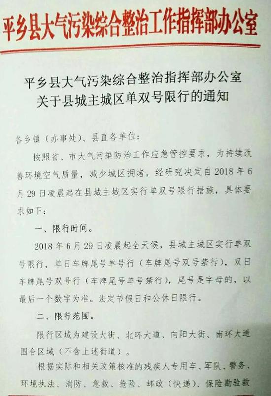 剛剛,接平鄉(xiāng)縣大氣辦通知,自6月29日零時起,平鄉(xiāng)縣將實行單雙號限行。 限號措施 縣城區(qū)內(nèi)實施單雙號限行,(含雙休日、節(jié)假日,含外地車),單號單日通行,雙號雙日通行,尾