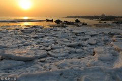 2018年1月18日,河北秦皇島,四九第一天北戴河,盡管今年海冰的規(guī)模不是很大,但夕陽下海冰還是別具特色的一道風景。圖片來源:丹尼/視覺中國 四九第一天北戴河,盡管今年海冰的...