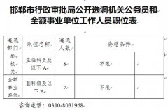 邯鄲市行政審批局選調(diào)機關(guān)公務員和事業(yè)單位工作人員 根據(jù)工作需要,依據(jù)《河北省機關(guān)事業(yè)單位干部調(diào)配辦法》等有關(guān)規(guī)定,決定為市行政審批局面向全市公開選調(diào)機關(guān)公務員和全額...
