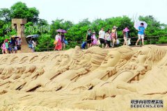 游客欣賞沙雕作品。 本報記者楊寬攝 水與沙,靜與動。 清澈的水歡快靈動,它的故事奔放熱烈;金色的沙靜謐深沉,它的故事源遠(yuǎn)流長。 走進(jìn)金沙灣沙雕大世界,盡是水與沙的壯美奇...